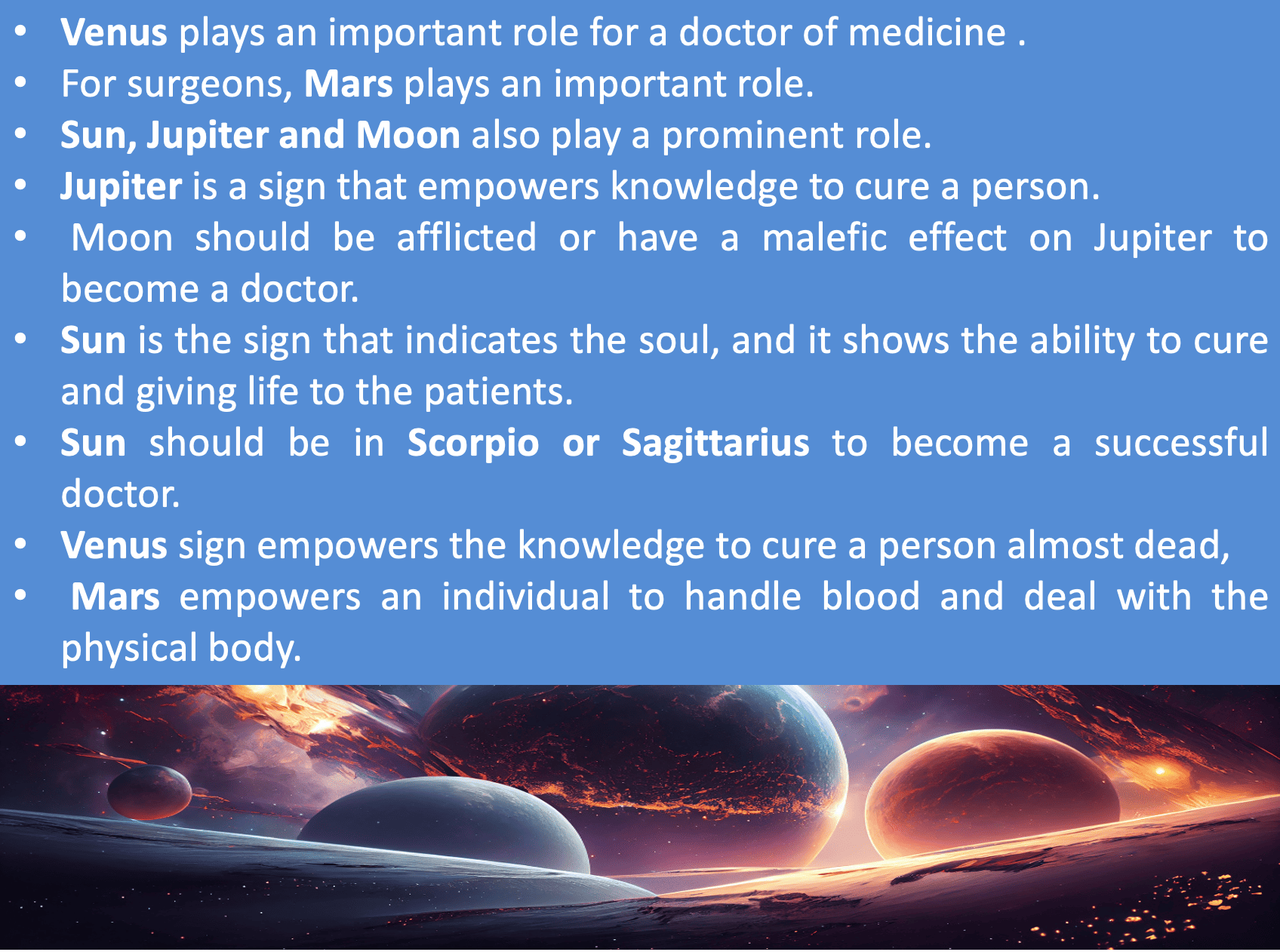 In Vedic Astrology, it is easy for one to predict what sort of professional field one shall choose in order to be successful in their professional front at the time of birth. Astrology gives an insight in the fine details of the professional life such the tenure between switching job, the lifespan of a career in a particular field, the post of the native’s profile and so on and so forth. There are many conjunctions or combination of planets that strongly indicate attraction to medical profession. Institutional Ethics Committee approval for Planetary positions favorable for medical professionals Distribute a questionnaire to collect data Horoscope of 150 medical students. Is there a correlation between horoscope signs and career choice as medical profession among medical student? Horoscope of 150 students of MBBS course. Horoscope of Student from field other than Medical coursePlanetary positions favorable for medical professionals